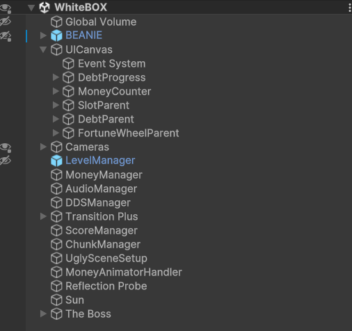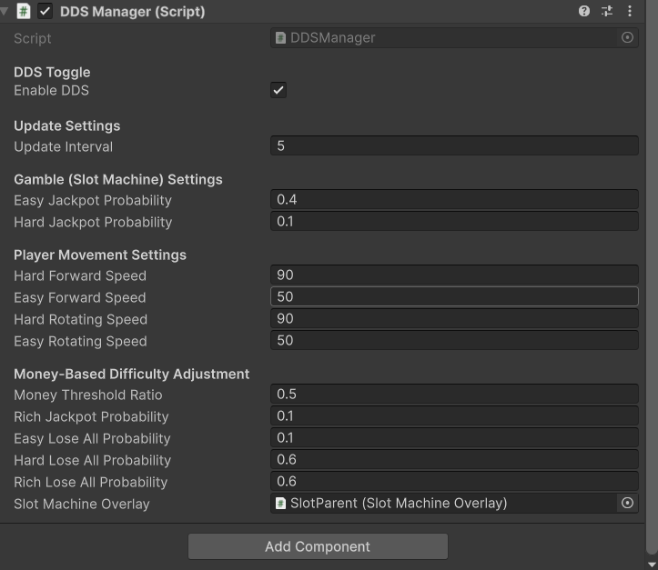 Dynamic Difficulty Scaling Manager: Created the manager that enhances the gameplay for players good and bad using rubber banding mechanics from Mario Kart. It works based on debt/money ratio and the more debt the player has the easies the game becomes (easy/medium/hard static difficulty values of which the values change inbetween based on ratios) it adjusts gambling odds like winning the jackpot or losing all money during a mini-game.