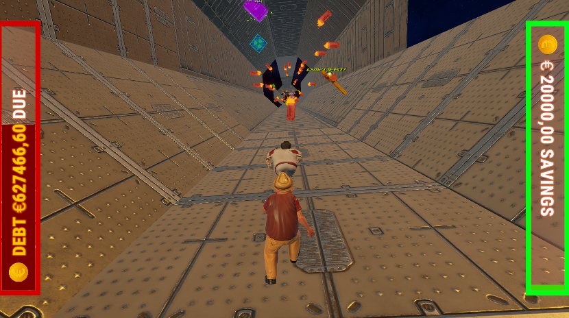 - Observe object spawning, tunnel recycling, and adjustments in speed and rotation as debt increases.