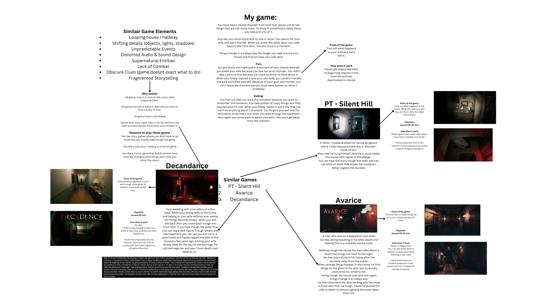 When I first started this R&D project, I wanted to do research on “what is the most effective horror enemy boss design that manipulates player emotions through story and environmental interactions?”. In the first guilt meeting, I heard that this scope was too big for the 4 weeks we had, and I needed to change it up. So I got the task to already make the demo, so I can show more clearly what I want as an end project. But with the demo I made, the main question wasn’t relevant anymore. So I still didn’t have a clear goal for what I wanted to research. The task I got for the next guilt meeting was that I have to do research on similar games. How they were made. What the plot of it is. What the game is about. And then think of what my game is really about. So I did that and found 3 similar games and wrote down the similar game elements, what the games are about, and then made a story for my own game about what it is about. After I showed what I researched, my goal was clear, and my main goal was to research how to bring guilt to the player of the game. Next, I had to do research on techniques that are used to bring guilt to players. I found 3 different ways to do this and showed examples of the games that use this and how it worked. In the last guilt meeting, we talked about how my current demo doesn’t have the ways to make the player feel guilty of things he did, and the main reason was that you just follow a story line and don’t make the decisions yourself. So I needed to make the demo better and put in the techniques I learned. The demo is not as long as I hoped, but that is mostly because I only had 4 days to make it, which is pretty short.