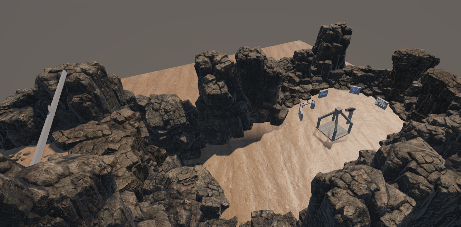 After the paper prototype, I translated the concept into a Unity demo. In the digital version, a wagon stood at the base of a mountain with a harpoon launcher nearby. Info boards explained the use of SOSCASTOA, and on a table, several ropes were laid out, each marked with its length. This version was tested by two people with no prior experience in trigonometry. Both were able to complete the puzzle with minimal help. The only assistance provided was how to walk around in the scene and how to open the calculator app. Interestingly, using a physical calculator worked better than the Windows one, likely due to its clearer layout. The most important change from the paper to the digital version wasn’t about the objects themselves, but about clarity — the feedback had shown me that players needed more help understanding how to apply SOSCASTOA.