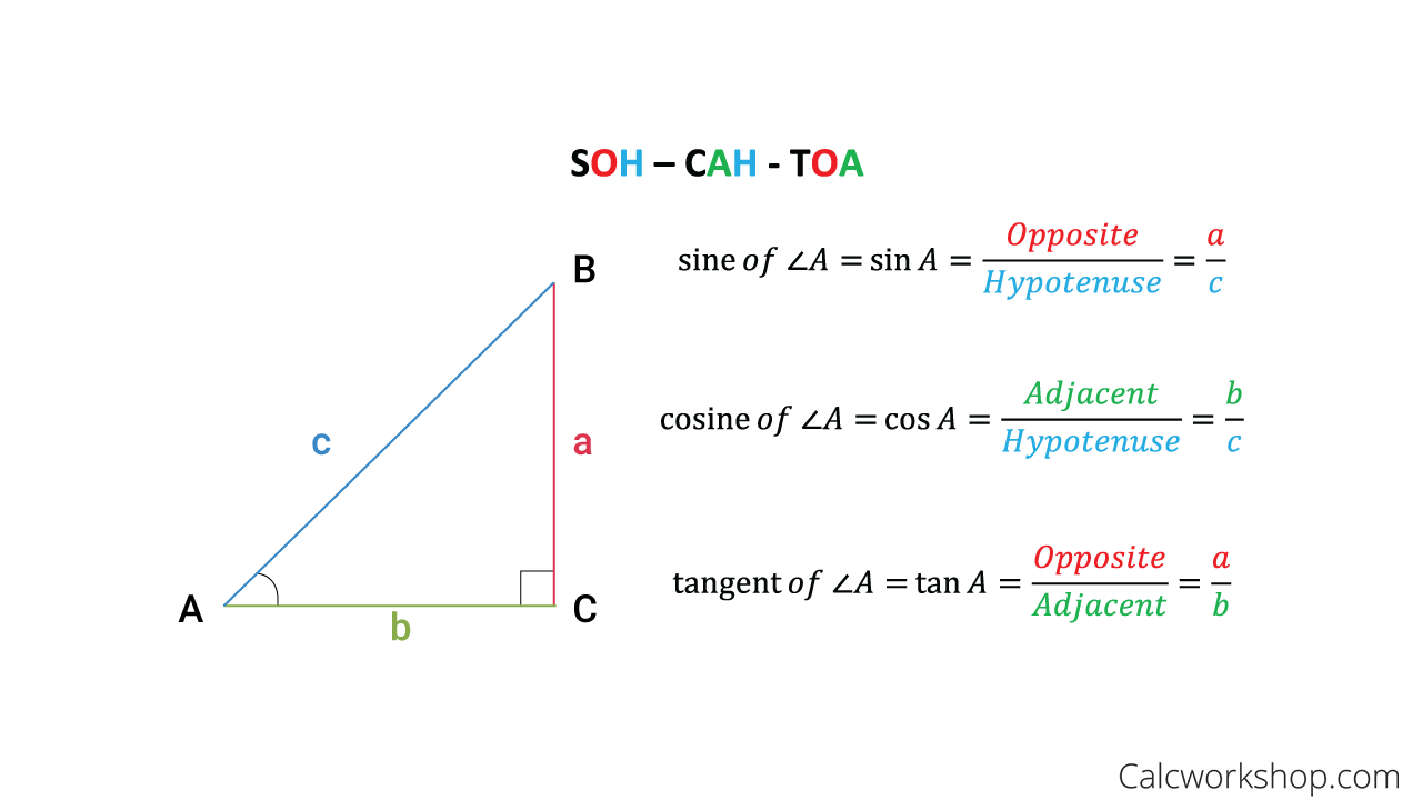 - Tangent (tan) = opposite / adjacent These relationships can be remembered using the mnemonic SOH CAH TOA.