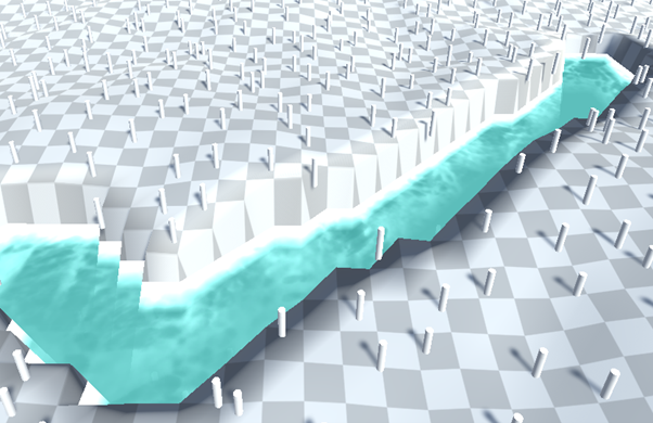 When the path is created, the algorithm loops through the river points and lowers the surrounding points in the terrain. This carved-out river is then filled up with water. Doing this creates the following results: