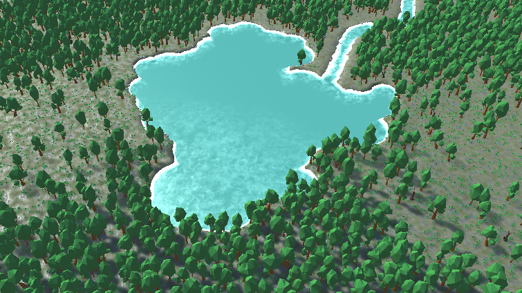 To create rivers in the forest biome, a river path needs to be made. This can be done by selecting two random points on the terrain or finding a high point in the terrain and creating a path flowing down the terrain by looking at neighboring points and choosing the lowest one each time. Since the terrain in a forest is mostly flat, the second option would generate short rivers which are not very realistic.