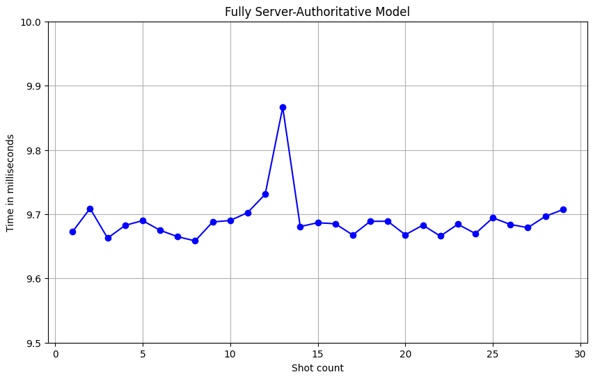 Graphs The graph below shows the time difference between the client sending the bullet firing command and the server processing the bullet spawn in the fully server-authoritative model.