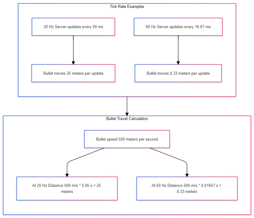 Let’s say you fire a bullet in a shooter game, and the bullet moves at a speed of 500 meters per second. The distance the bullet travels between server updates depends on the tick rate.