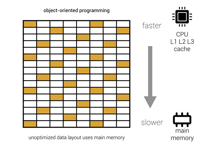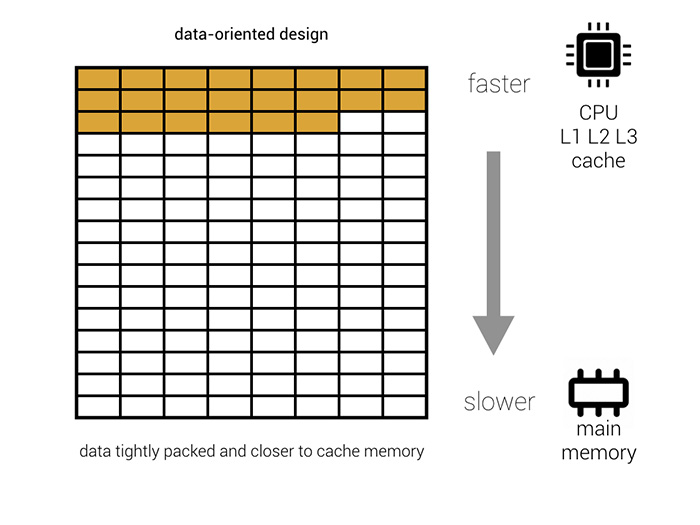 The performance gain is achieved through highly optimised memory management. Primarily utilising the CPUs caches instead of outsourcing to the RAM reduces memory access times drastically. Making a difference in reducing access times from milliseconds to nanoseconds [3].