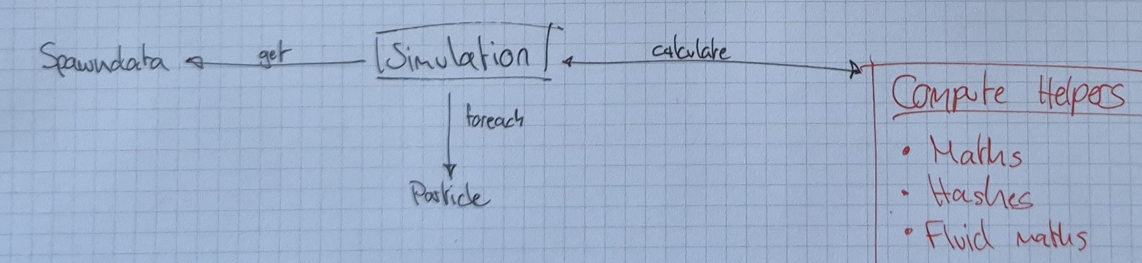 The fluid simulation uses Unity’s compute shader [16] in order to achieve acceptable performance. Since the simulation calculates the behaviour of every particle it makes sense to outsource the workload to the GPU. In this project the compute shaders to the heavy lifting of calculating the simulations behaviour. ComputeBuffer are used to hold the values of each particle and so-called kernel-ids determine what calculations must be performed.