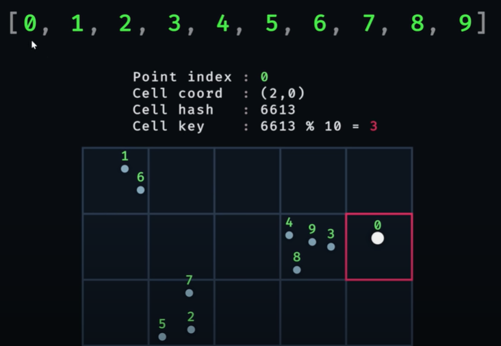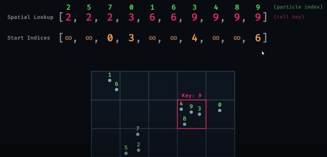 To calculate densities a Nearest Neighbour Search [21] algorithm is implemented. Instead of iterating through every particle, the simulation is split into multiple sections.The particle is assigned a hash and cell key which are important for the simulation to only consider the nearest particles during its calculations.