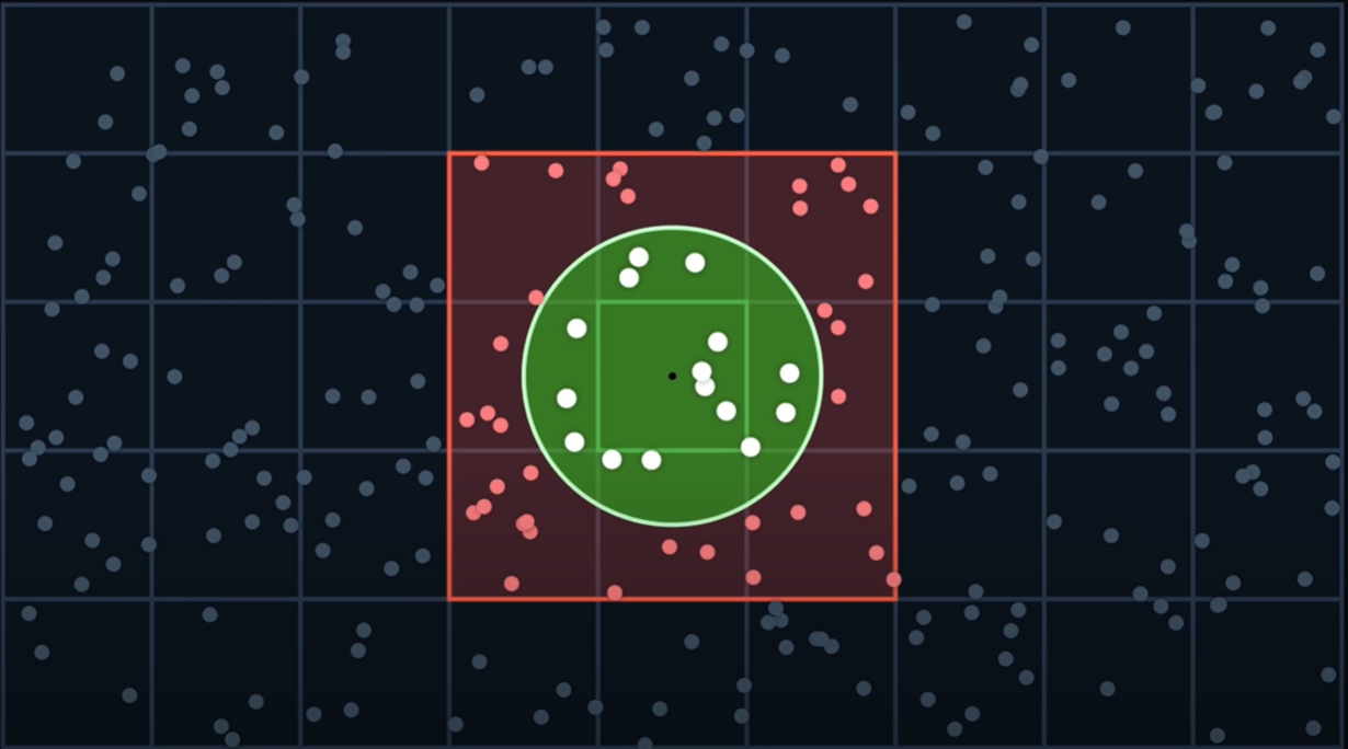 While the first “cell” value is quite high and possibly faulty the second value is definitely not correct. These “cell” values require the smoothingRadius variable to work. The red cells around the particle identify the nearest neighbours for the particle and the green circle determines how strong the repelling force on the surrounding particles is depending on how close they are: