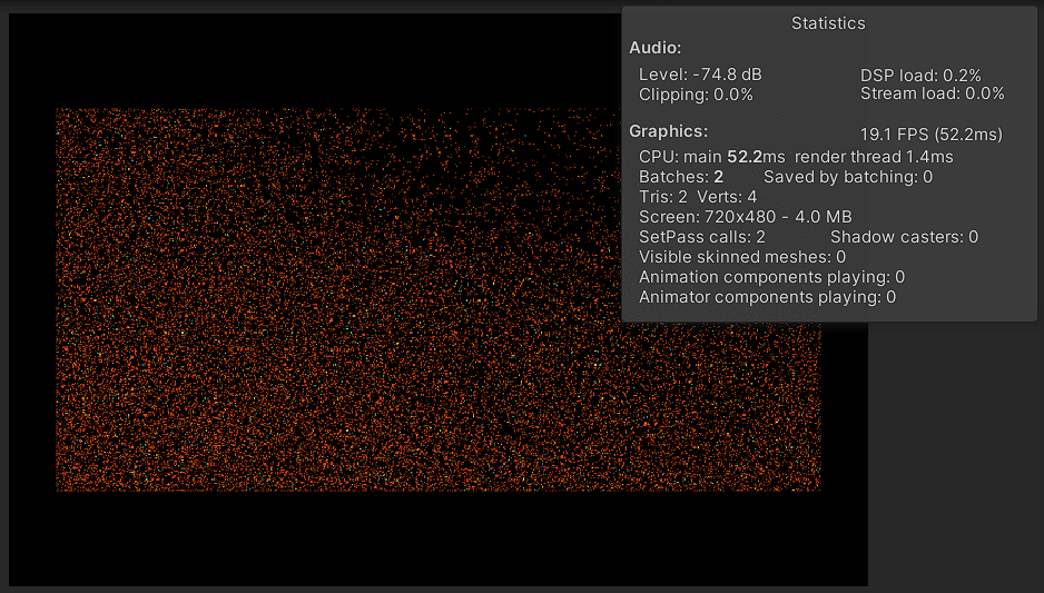 Before the coding could begin, the Fluid-Sim project had to be configured to work with ECS, which is explained in the section Project Configuration. In this preparation phase I’ve set up a Testing Pipeline in order to track what changes impact performance the most. I expected the implementation to take longer as planned. So I was prepared to scale down the performance benchmarking and eventually that I couldn’t build a more efficient ECS project than the compute shader approach. The first “working” version of the ECS Fluid-Sim looked like this: