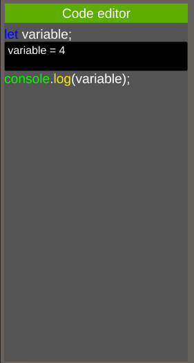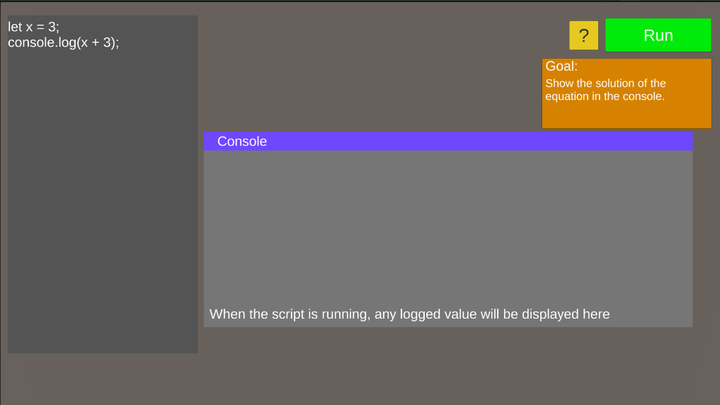 For the variables 6 levels were made. The first level showed the player what an variable was using Algebra as context. The first level already had the code provided so that the player can safely see the new code. The second level explained more deeply what each part of the variable declaration does. The player once again only has to write code they already knew. The third level asked the player to increase the current variables value by 4. The fourth asked the player to declare and log a variable without any help. This tests the player if they understand the variable declaration. The fifth showed the player that it’s possible to assign a value to an already existing variable. The last level tasked the player to swap the value of two variables. This was quite hard and I already expected that this might be too difficult for the player to yet understand.